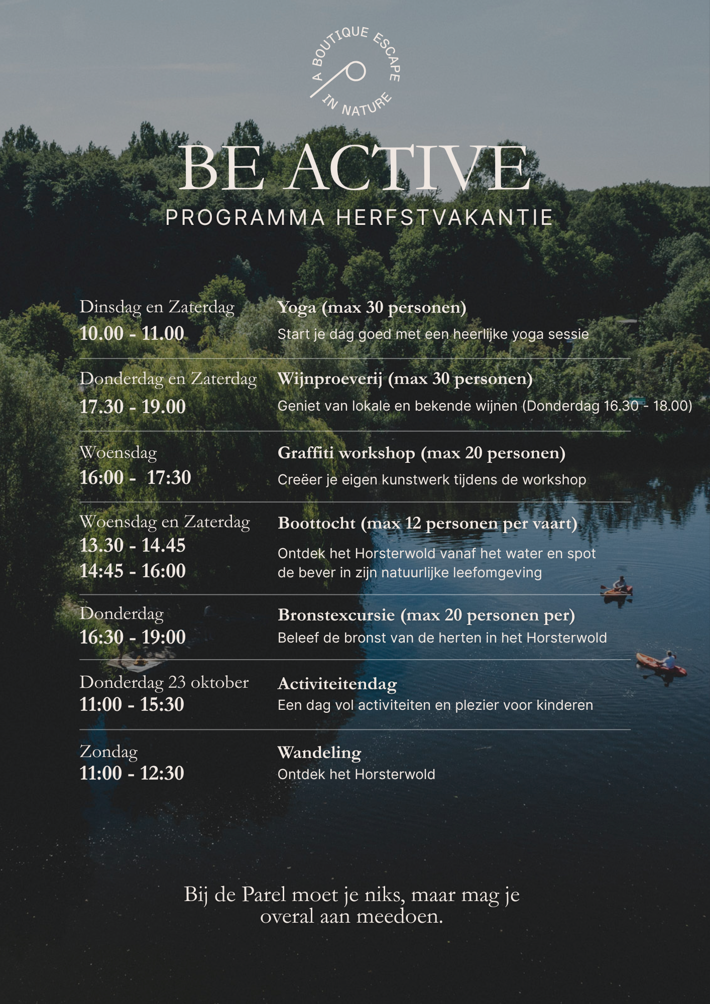 In The Pearl müssen Sie nichts tun, sondern können an allem teilnehmen. Jeden Monat organisieren wir Aktivitäten, die zum Rhythmus der Natur und der Atmosphäre unseres Anwesens passen. Beginnen Sie den Tag in aller Ruhe mit Yoga am Wasser. Probieren Sie lokale Weine bei einer kleinen Verkostung. Entdecken Sie den Horsterwold von einem Boot aus oder lassen Sie Ihrer Kreativität bei einem Workshop freien Lauf. Alles ist optional, nichts ist obligatorisch. Sie wählen aus, worauf Sie Lust haben. Und genau das ist das Besondere: Raum zum Mitmachen, aber auch zum stillen Vorbeiziehenlassen.