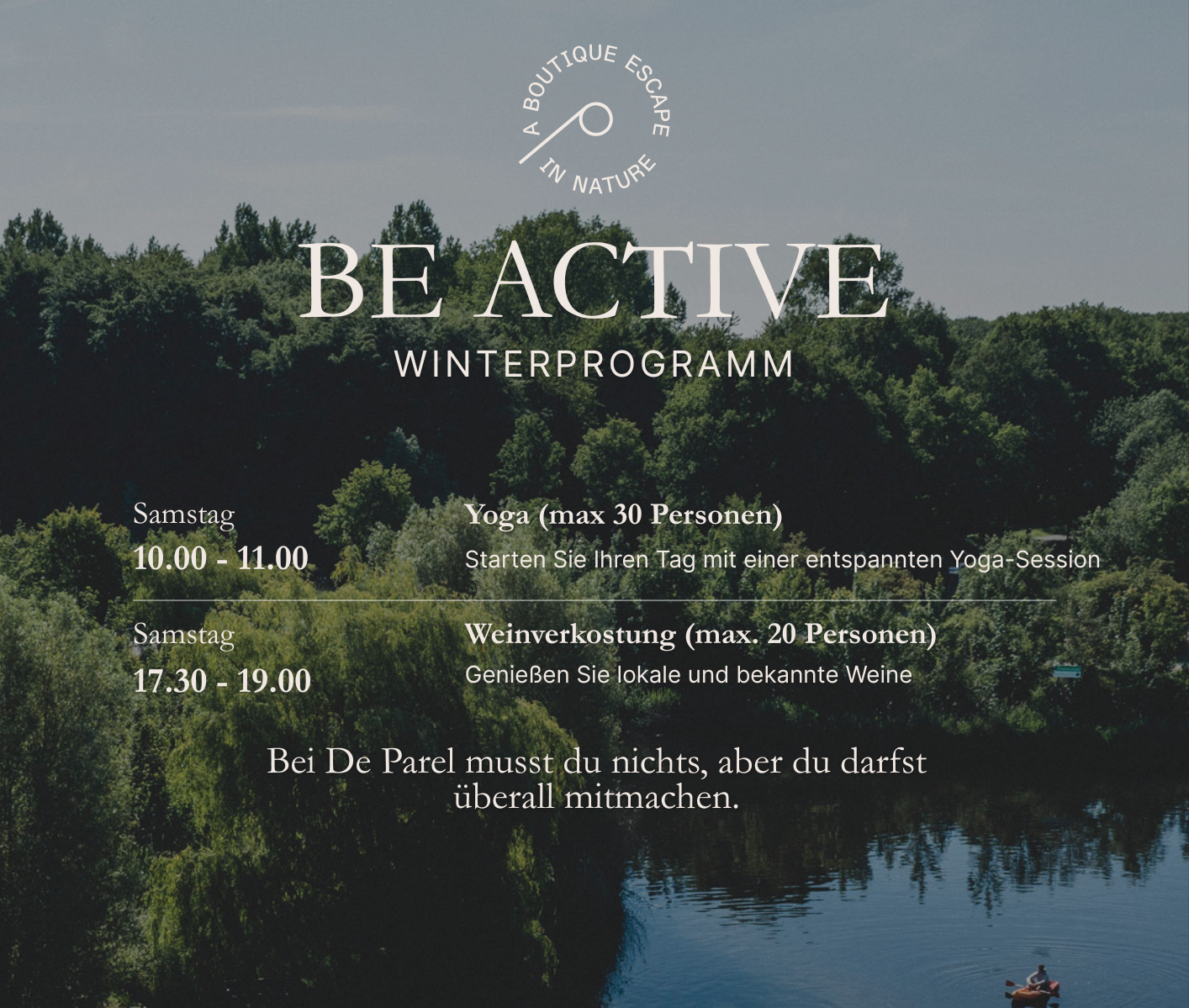 In de Parel müssen Sie nichts tun, sondern können an allem teilnehmen. Jeden Monat organisieren wir Aktivitäten, die zum Rhythmus der Natur und der Atmosphäre unseres Anwesens passen. Beginnen Sie den Tag in aller Ruhe mit Yoga am Wasser. Probieren Sie lokale Weine bei einer kleinen Verkostung. Entdecken Sie den Horsterwold von einem Boot aus oder lassen Sie Ihrer Kreativität bei einem Workshop freien Lauf. Alles ist optional, nichts ist obligatorisch. Sie wählen aus, worauf Sie Lust haben. Und genau das ist das Besondere: Raum zum Mitmachen, aber auch zum stillen Vorbeiziehenlassen.