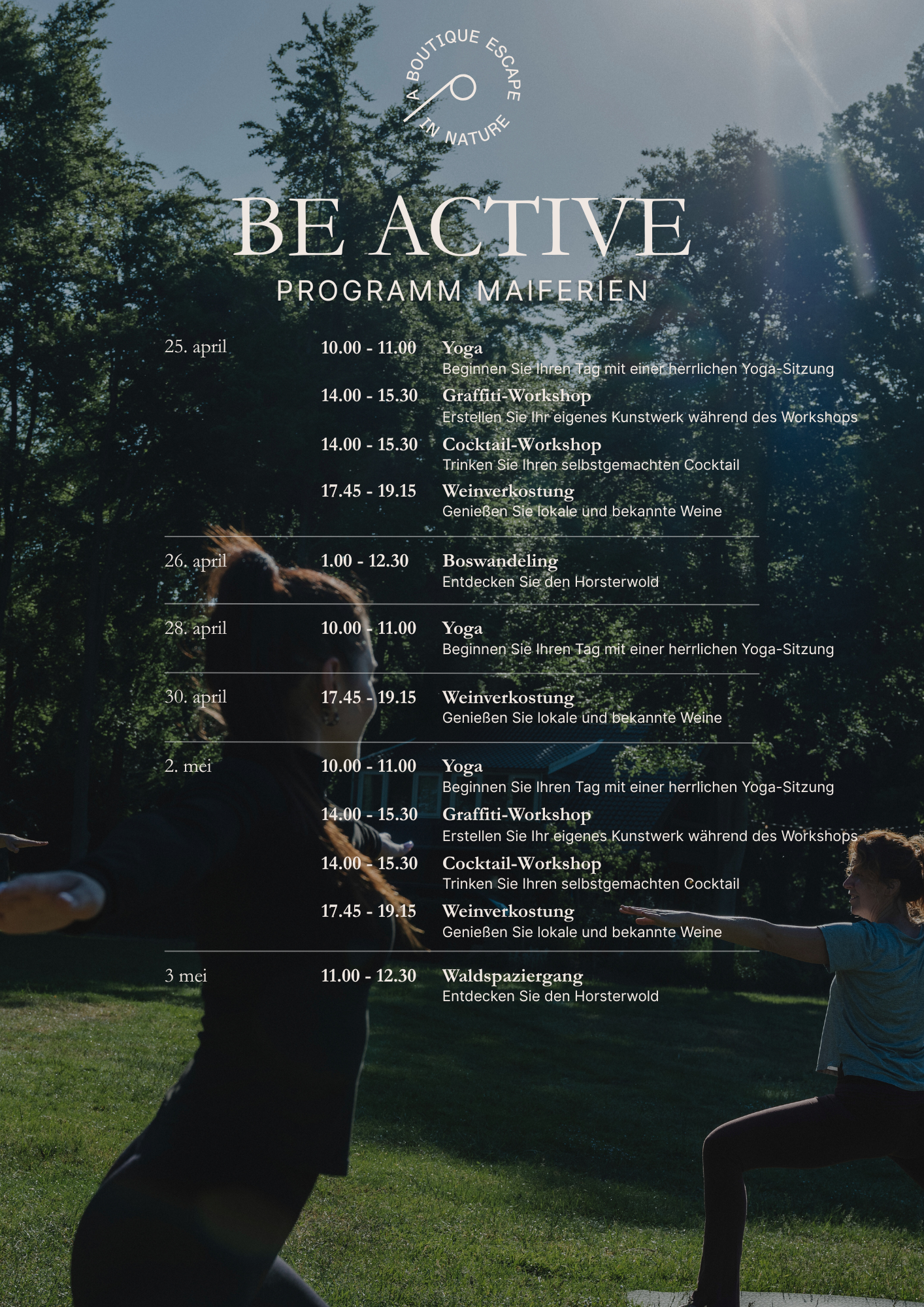 Die Maiferien stehen ganz im Zeichen des Frühlings; die angenehmen Temperaturen, die blühende Natur und die aufkommende Sonne. Bei De Parel feierst du die Maiferien in vollen Zügen! Übernachte in einem einzigartigen Glamping-Zelt und erlebe das Campinggefühl mit einem Hauch von Luxus! Oder entdecke die Lodges und Villen, optional mit privatem Wellness. Außerdem kannst du dich zur Entspannung auch im zentralen Wellnessbereich aufhalten, während du dich im Workout-Bereich sportlich betätigen kannst!
