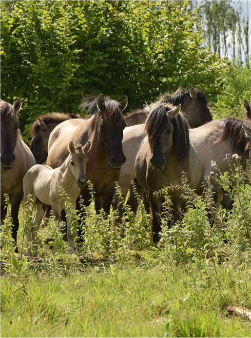 In Horsterwold gibt es viele Tiere zu sehen, sowohl zu Lande als auch in der Luft. Wenn Sie lautlos durch den Wald spazieren, sehen Sie vielleicht plötzlich ein Reh zwischen den Bäumen stehen. Wilde Konikpferde grasen ruhig auf den Lichtungen - sie sind an Menschen gewöhnt und fressen oft einfach weiter, wenn man an ihnen vorbeigeht. In der Nähe des Wassers hört man manchmal ein Plätschern - ein Biber taucht ab. Über Ihrem Kopf kreist ein Bussard, und wenn Sie Glück haben, sehen Sie einen Weißkopfseeadler vorbeifliegen. Im Frühling ist der Wald voll von singenden Vögeln. Am Rande des Wassers zieht manchmal ein blauer Streifen vorbei - ein Eisvogel, der nach Fischen taucht. Und wenn Sie ganz still am Wasser stehen, sehen Sie vielleicht einen Löffler mit seinem seltsamen löffelförmigen Schnabel durch das seichte Wasser waten.