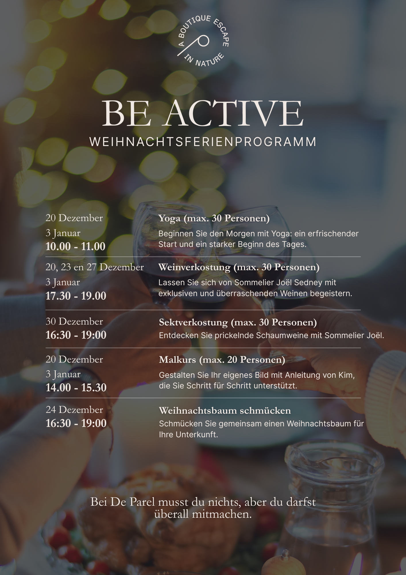 In unserem Park und der Umgebung gibt es viel zu erleben. Spaziere im angrenzenden Naturschutzgebiet 'Het Horsterwold' und lass dich von der Wintermagie verzaubern. Aber... während der Weihnachtsferien kannst du dich auch bei der Parel selbst bestens amüsieren. Probier den Geschmack von lokalen und bekannten Weinen bei einer gemütlichen Verkostung oder erlebe einen entspannten Urlaub in unserem Yoga- und Wellnessbereich.